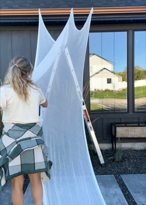 I used those metal gutter clips, found on Amazon, to hang the fabric from my gutter before I started the cutting process. It's a solid base for your cobwebs and makes the whole thing way more manageable.