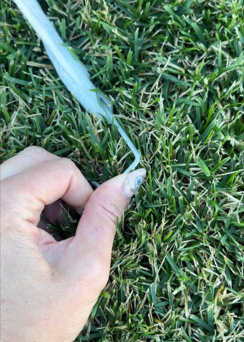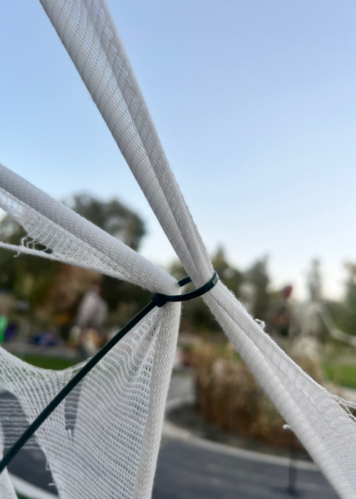 Once you've finished your cutting masterpiece, all you need are some landscape pins to keep the bottom parts in place. It's the finishing touch that ensures your cobwebs stay perfectly creepy. I also used small zipties to secure two sides of separate strips together if I felt like there was too much of a gap between them.